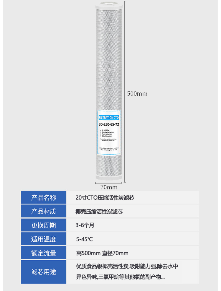 简要描述:CTO压缩活性炭滤芯:以好的果壳炭及煤质活性炭为原料,采用高科技技术,经特殊工艺加工而成,活性炭滤芯内外均分别包裹
