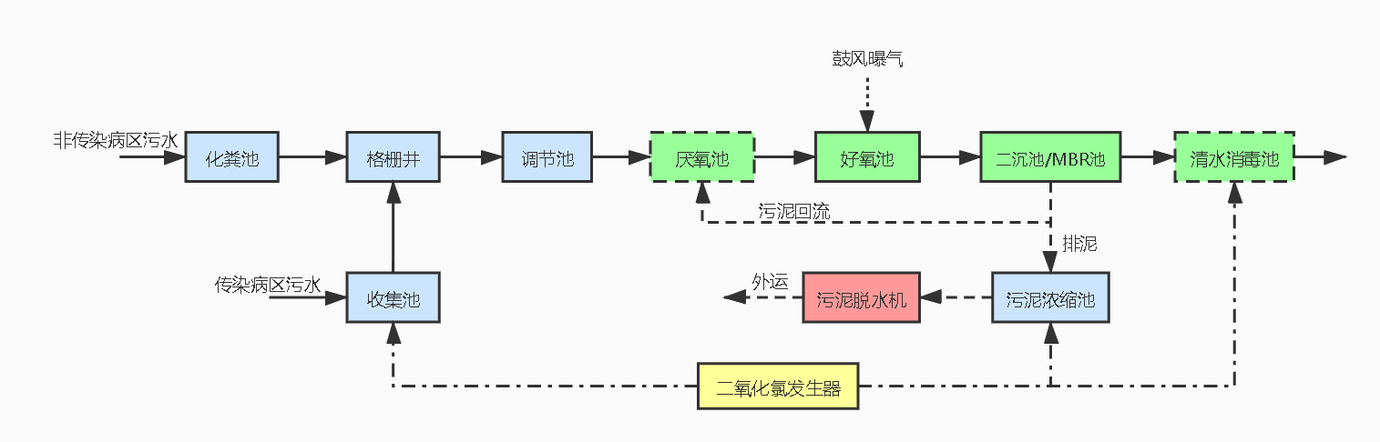 医院废水处理主要是消毒,即杀灭病原体。医院废水的水质十分复杂,一般随着用水量的增大,相应的污染物浓度也越来越高,医院废水处理流程应尽可能设调节池,调节池不但可以调节水量,消灭高峰负荷,并可以调节水质,使其处理效果不会因水质变化而受到干扰二氧化氯消毒剂的投加点一般选择在调节池之后。浮选沉淀后经消毒池(由二氧化氯混合发生器制备的消毒剂)进行消毒后,达标排放。自发浮选沉淀池的剩余污泥排入调节池,调节池和接触氧化池的污泥打入污泥消化池进行好氧消化处理可达标排放。